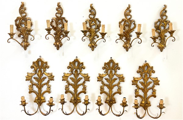 Gruppo di nove diverse appliques a due luci in legno intagliato e dorato con bracci in metallo (h max cm 50) (difetti)