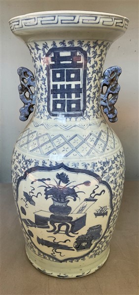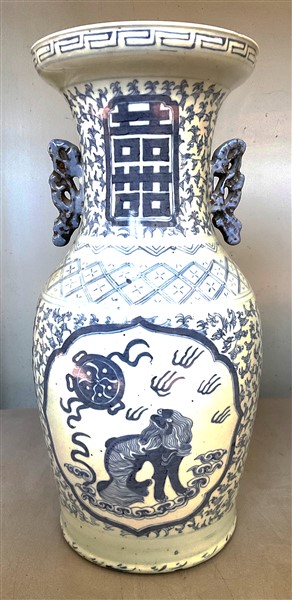 Vaso biansato in porcellana bianca e blu decorato con carattere shou e animali fantastici