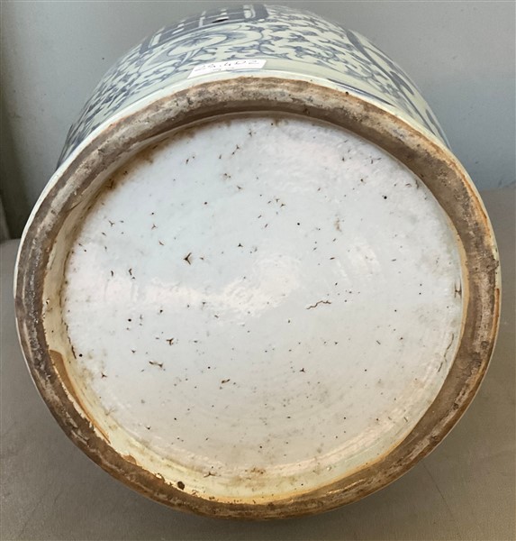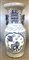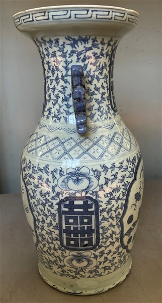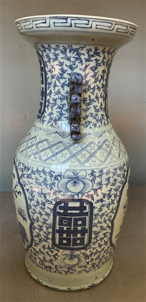 Vaso biansato in porcellana bianca e blu decorato con carattere shou e animali