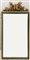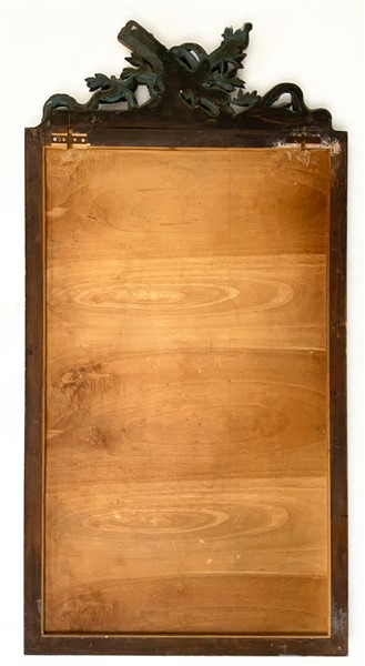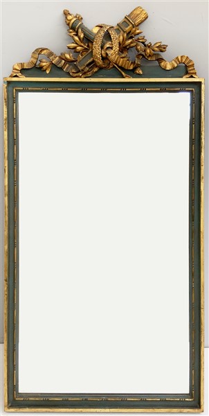 Specchiera in legno laccato e dorato con cimasa intagliata a faretra, fiaccola e motivo a nastro (cm 138x72) (difetti)