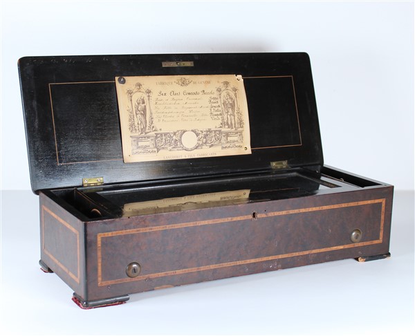 Langdorff & fils fabricants, Ginevra. Scatola musicale modello "Concerto piccolo" a cilindro con cassa in legno filettato. Nel coperchio è presente il cartiglio con indicazione delle sei arie, 1880 ca. (cm 57,5x14x23) (difetti e mancanze)