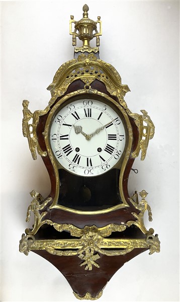 Orologio del tipo Neuchatelois con mensola in legno laccato e metallo dorato. Q