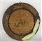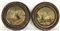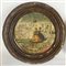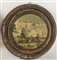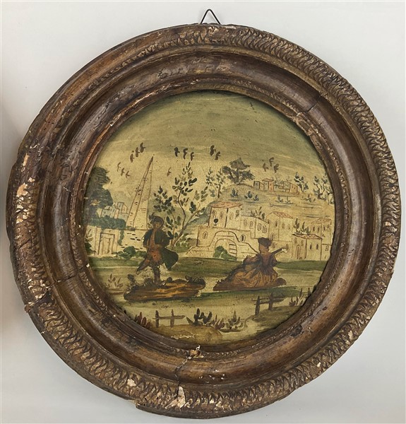 Arte del secolo XVIII. Coppia di composizioni in arte povera su tavola tonda raffiguranti scene di genere entro paesaggio (diam. cm. 26) In cornici. (difetti)