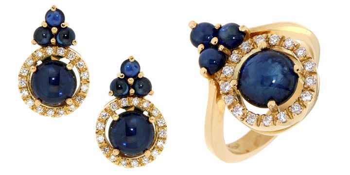 Demi -parure composta da coppia di orecchini ed anello in oro giallo con zaffiri taglio cabochon e diamanti taglio brillante per complessivi ct 0,30 ca
