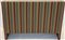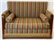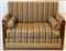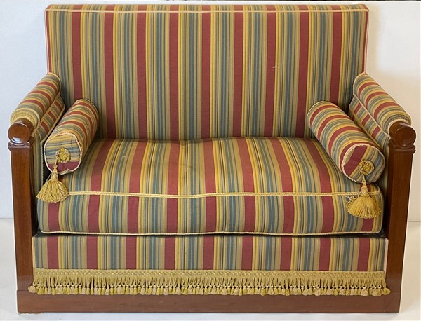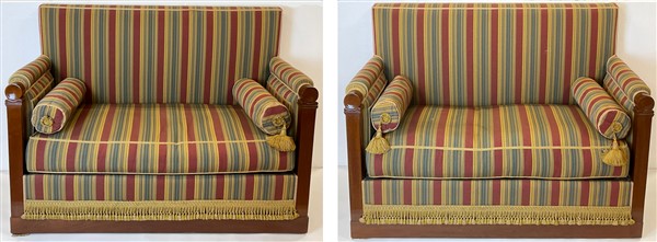 Coppia di divani in mogano con montanti a plinto e bracciolo terminante a cilindro. Rivestiti in tessuto rigato. Secolo XIX (L. cm 131) (difetti)