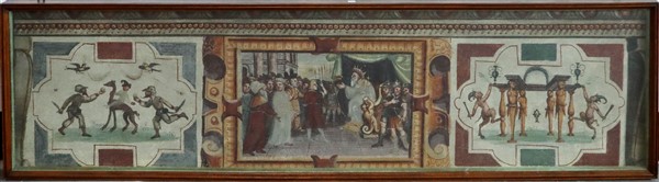 Arte del secolo XIX. Lotto composto da due tecniche miste su tela raffiguranti rispettivamente scena biblica e grottesche entro riserve architettoniche e veduta urbana (cm max 192x48) Entro teche (difetti)