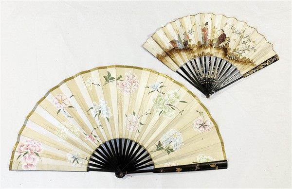 Manifatture orientali, secolo XIX. Lotto di due ventagli con stecche in legno ebanizzato, laccato e dorato e pagine in carta. Dipinte rispettivamente a fiori e figure orientali entro paesaggio, uno con monogramma (difetti)