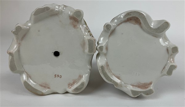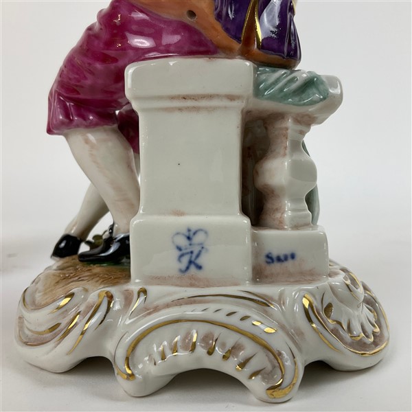 Manifattura tedesca. Due gruppi in porcellana decorata in policromia raffiguran