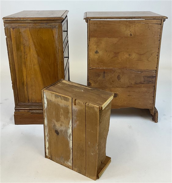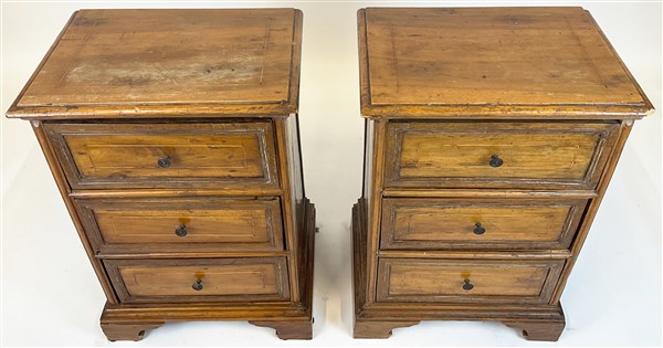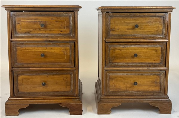 Coppia di comodini in legni vari a tre cassetti pannellati, piedi a mensola. Secolo XIX (cm 49x71x35) (difetti e restauri)