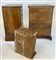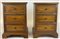 Coppia di comodini in legni vari a tre cassetti pannellati, piedi a mensola. Se