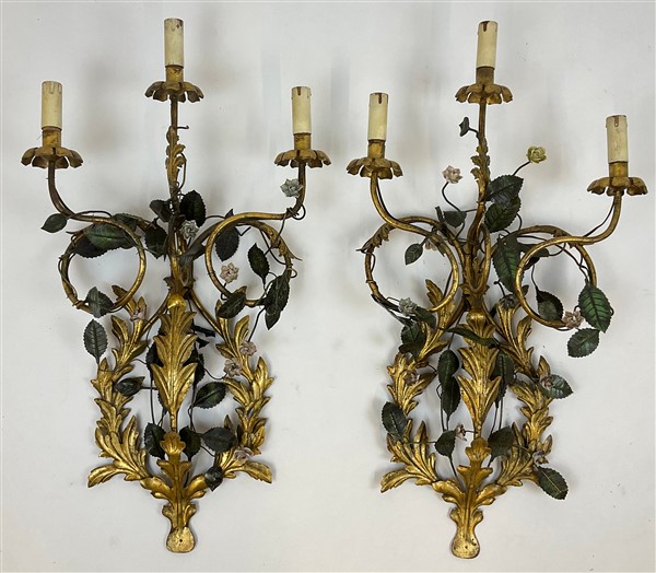Lotto 1372 | Coppia di applique in metallo dorato e dipinto a tre fiamme decorate a foglie e