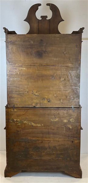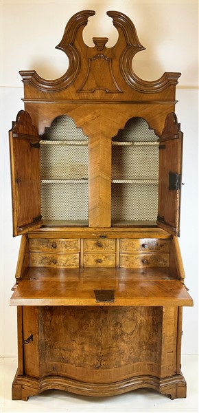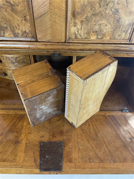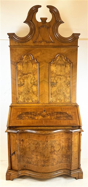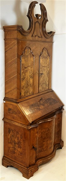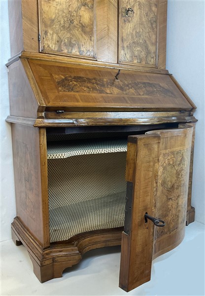 Trumeau lastronato in noce e radica di noce, parte inferiore mossa ad un'anta e calatoia che rivela cinque tiretti. Parte superiore a due ante pannellate e cimasa intagliata. Secolo XVIII (cm 114x241x57) (difetti, restauri e sostituzioni)