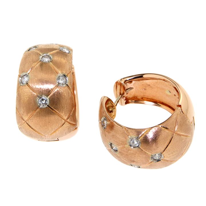 Coppia di orecchini in oro rosa lucido e satinato, a forma di cerchio: parte anteriore lavorata con diamanti taglio brillante per complessivi ct 0,60 ca
