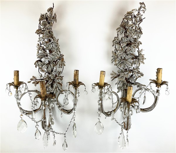 Coppia di applique a tre fiamme con struttura in metallo decorata a fiori in ve
