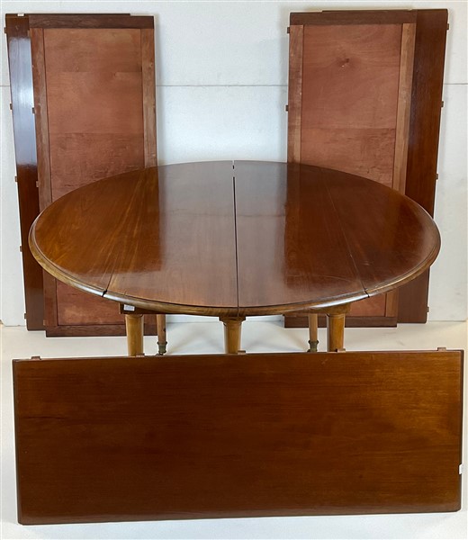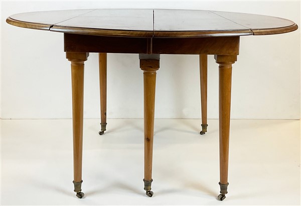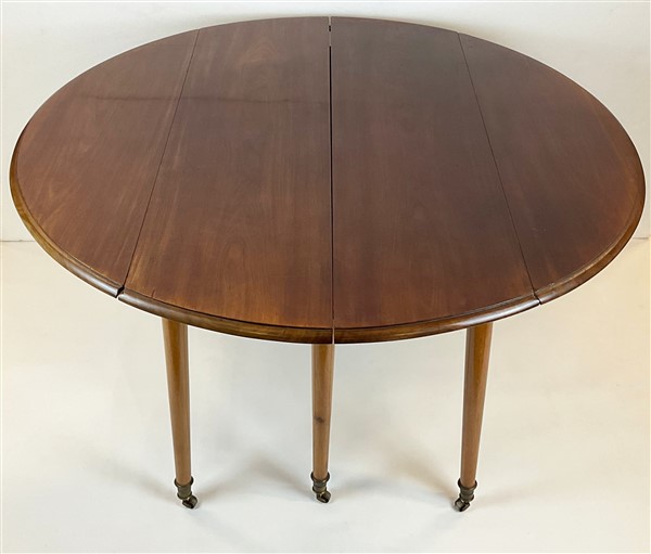 Tavolo ad alette in mogano allungabile con sei gambe rastremate su ruotine, dotato di cinque allunghi. Secolo XIX (d chiuso cm 127,5; h cm 72,5) (difetti)