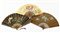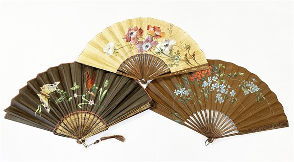 Lotto di tre ventagli con stecche in legno intagliato e dorato con pagine in carta e tessuto. Dipinti in policromia a fiori e farfalle. Uno firmato L. Gerard (difetti)