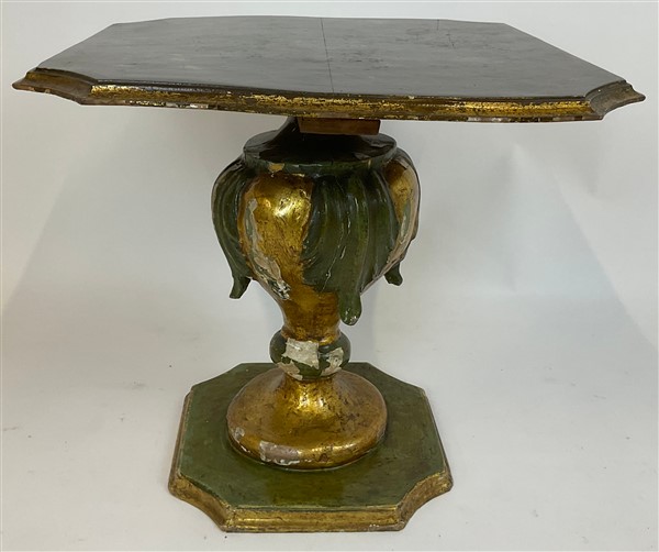 Tavolino in legno intagliato, dorato e dipinto, sostegno a balaustro, base sago