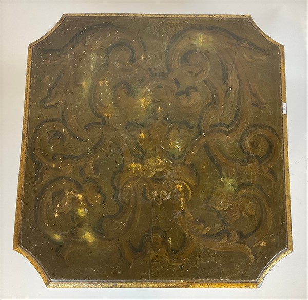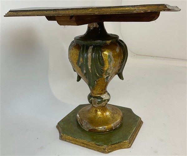 Tavolino in legno intagliato, dorato e dipinto, sostegno a balaustro, base sagomata (cm 53x49x55) (difetti)