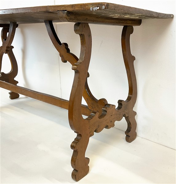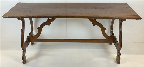 Lotto 1448 | Antico tavolo fratino in noce con gambe a lira e raccordi sagomati (cm 176x78x6