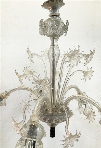 Manifattura di Murano. Lampadario a quattro luci in vetro incolore decorato a foglie e fiori (difetti)