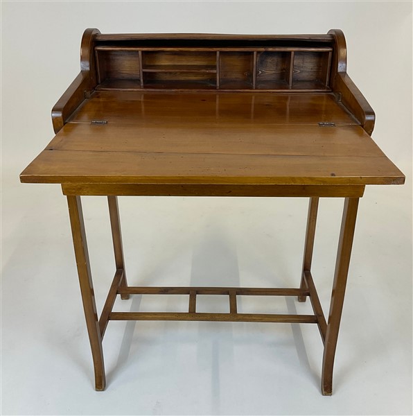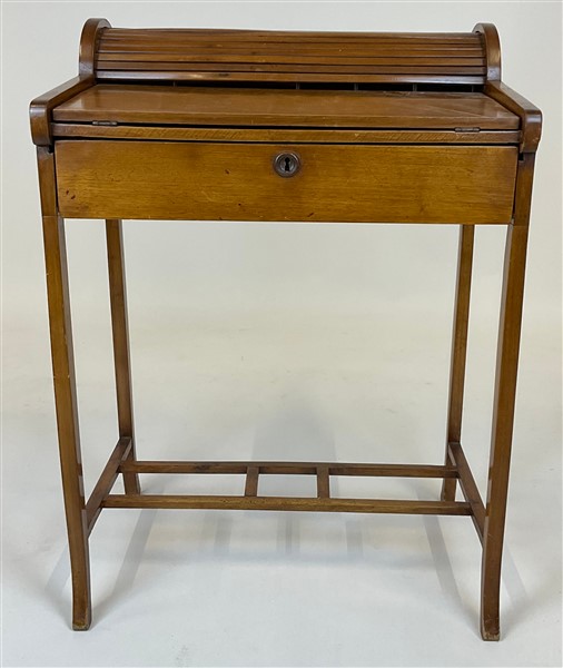 Lotto 1456 | Piccolo scrittoio con piano apribile a libro e alzata a rullo celante vani, cas