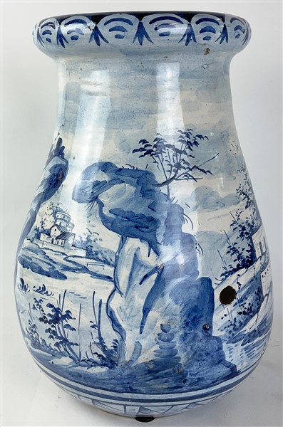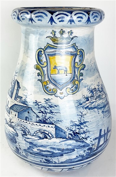 Vaso in ceramica piriforme decorato in blu a paesaggio e stemma araldico coronato in policromia (h cm 49) (difetti)