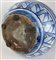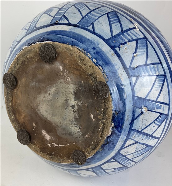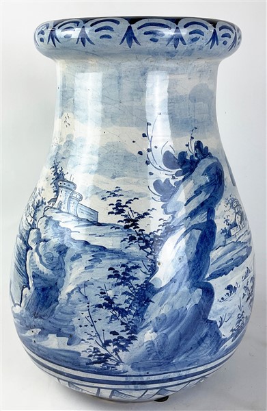 Vaso in ceramica piriforme decorato in blu a paesaggio e stemma araldico corona