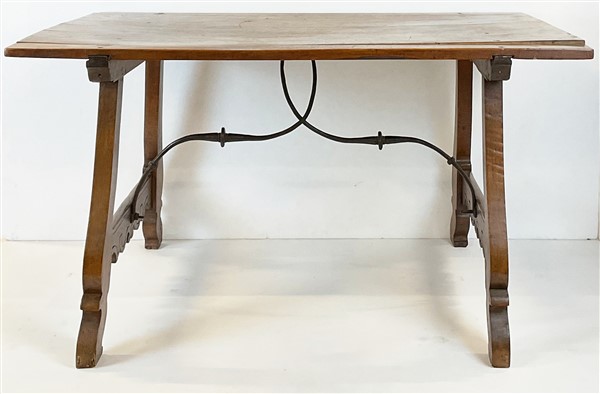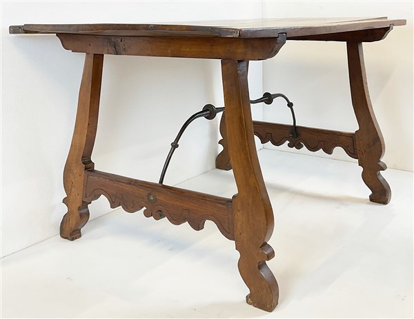 Antico tavolo fratino in noce con gambe sagomate a lira e raccordi in ferro for