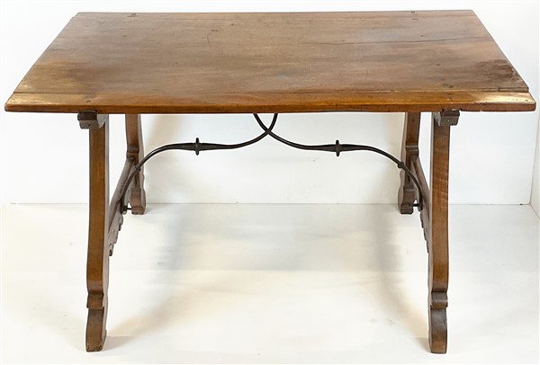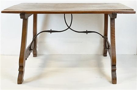Antico tavolo fratino in noce con gambe sagomate a lira e raccordi in ferro forgiato (cm 139x77x87) (difetti)