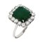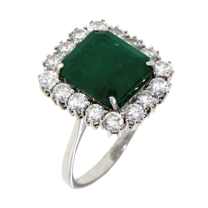 Anello in oro bianco, sommità con smeraldo taglio rettangolare e contorno di diamanti taglio brillante per complessivi ct 1,60 ca