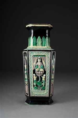 Vaso in porcellana policroma Famiglia Nera decorato con figura di Guanyin a rilievo