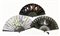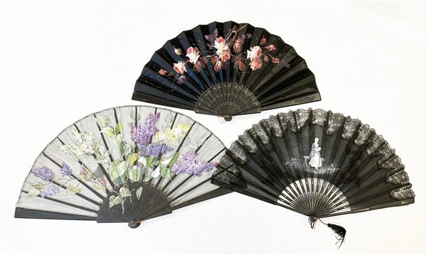 Lotto di tre ventagli in legno ebanizzato e traforato con pagine in tessuto e pizzo raffiguranti fiori, di cui uno firmato (difetti)
