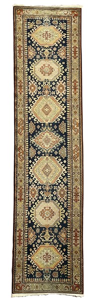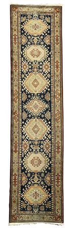 Tappeto passatoia rumeno, recente manifattura. Decoro con fila di medaglioni esagonali su fondo blu notte (cm 395x95) (difetti)