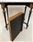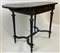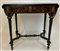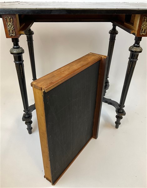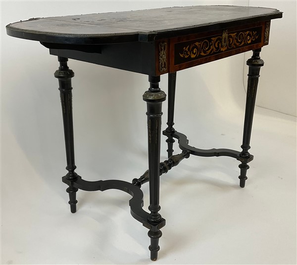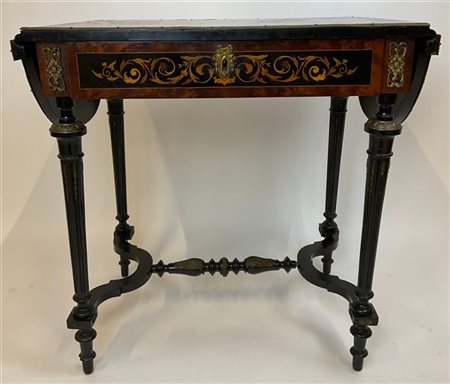 Tavolo ad alette lastronato, filettato e intarsiato a volute e motivi floreali in legni vari, gambe rastremate e scanalate riunite da traverse, un cassetto nella fascia. Profili e fregi in metallo. Secolo XIX (chiuso: cm 69x74x52) (difetti)