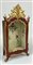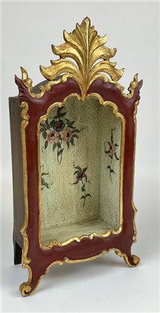 Teca in legno con fronte intagliato, dipinto e dorato a volute con cimasa a foglie (h cm 56) (difetti)