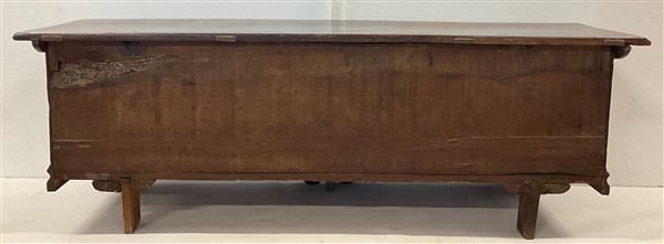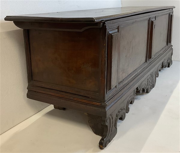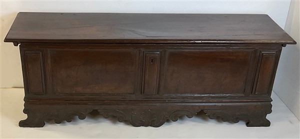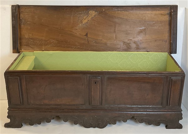 Cassapanca in noce con fronte e fianchi pannellati, grembiale intagliato a volute. Secolo XVIII (cm 168x58x50) (difetti e restauri)