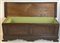 Cassapanca in noce con fronte e fianchi pannellati, grembiale intagliato a volu