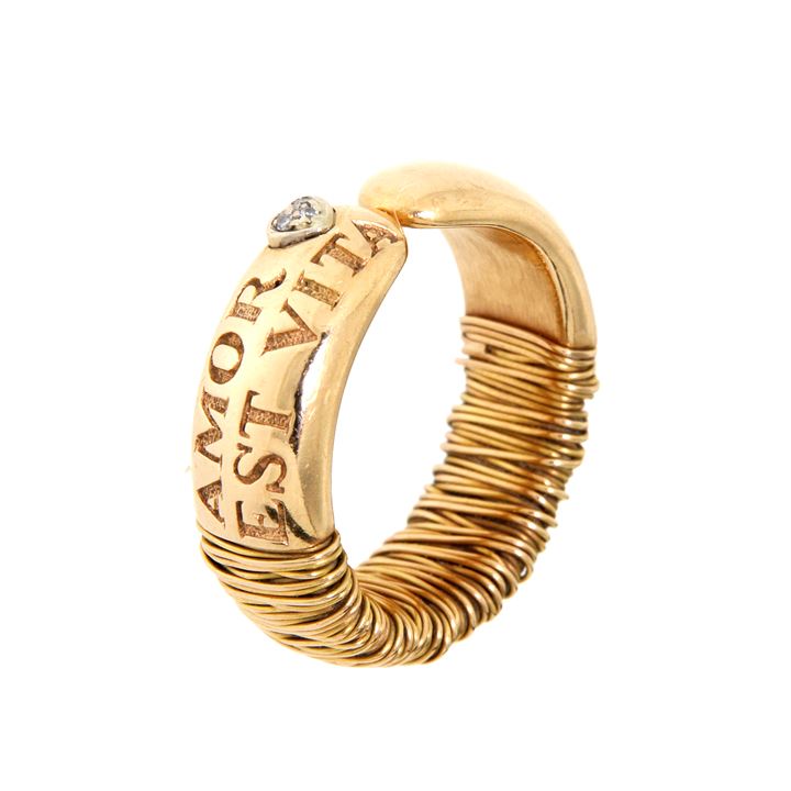 Anello in oro giallo, firmato "Pasquale Bruni", a fascia, lavorata a fili, recante scritta "Amor est vita" e un piccolo cuoricino in oro bianco con diamantini