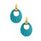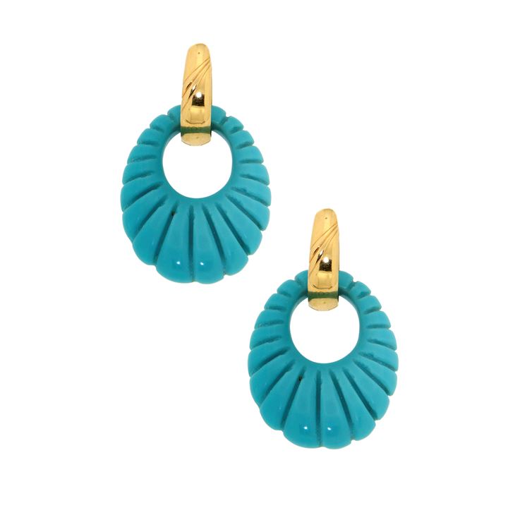 Coppia di orecchini in oro giallo, a cerchio, con pendenti in turchese, di forma ovale, lavorati