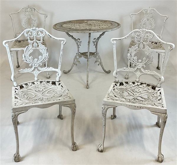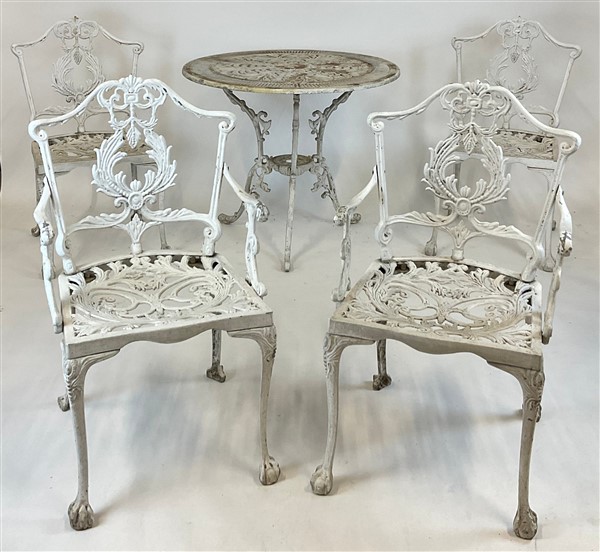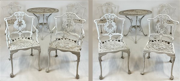 Fornitura da giardino composta da una coppia di tavolini tripodi con piano circolare, due poltrone e sei sedie in ferro forgiato e dipinto a volute fogliate, le gambe delle sedie terminanti ad artiglio su sfera (tavolo h. cm 68,5; d. cm 80,5) (difetti)