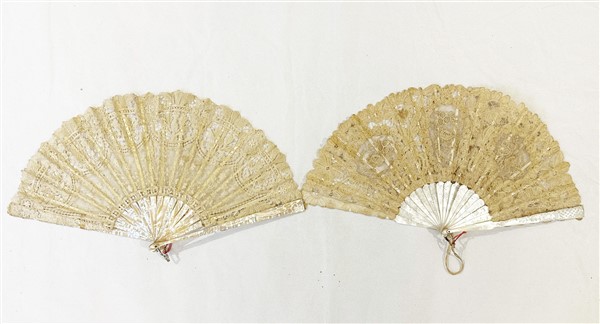 Arte del secolo XIX. Lotto di due ventagli con stecche in madreperla e pagine in pizzo ricamato a motivi floreali (difetti)