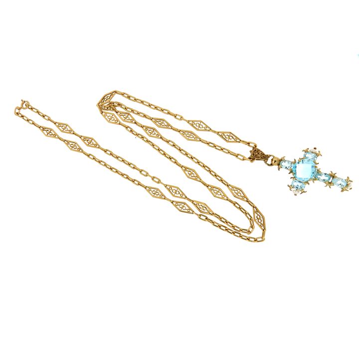 Catena composta da maglie romboidali alternate a maglie semplici con ciondolo in oro giallo a forma di croce, con acquamarine sfaccettate e taglio ovale