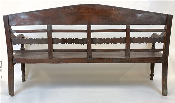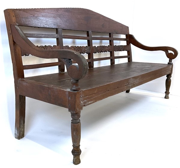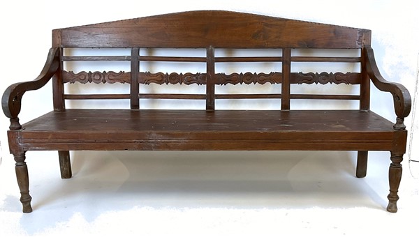 Divano in legno intagliato con schienale traforato a cartelle, braccioli a ricciolo e volute, gambe tornite (L. cm 201) (difetti)