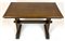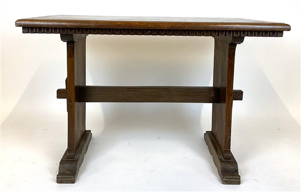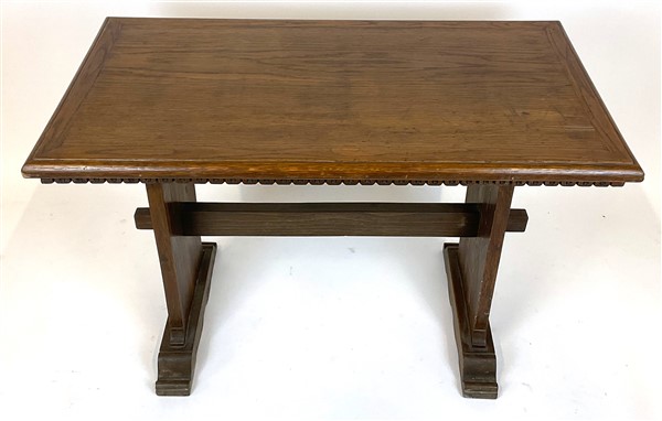 Tavolino in legno, montanti riuniti da traversa, cornice dentellata sottopiano (cm 99x64,5x55) (difetti)