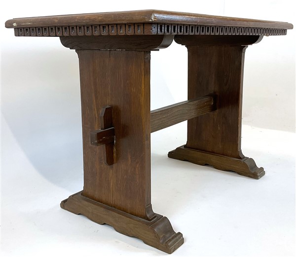 Tavolino in legno, montanti riuniti da traversa, cornice dentellata sottopiano