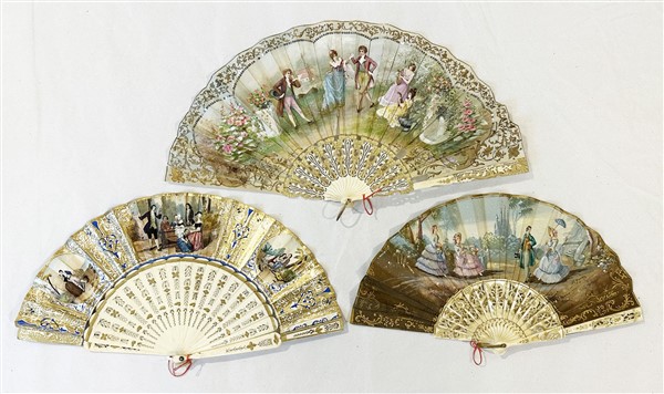 Lotto di tre ventagli con stecche in osso inciso, traforato e dipinto con pagine in materiali differenti. Raffiguranti scene galanti, di cui uno firmato Garcia (difetti, mancanze e restauri)