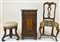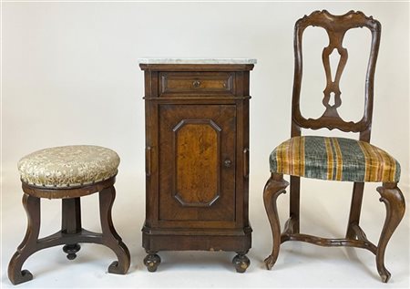 Lotto composto da un comodino in noce ad un'anta ed un cassetto con piano in marmo, uno sgabello da pianoforte su tripode e una sedia con schienale centrato da cartella traforata. Secolo XIX-XX (difetti e restauri)