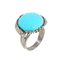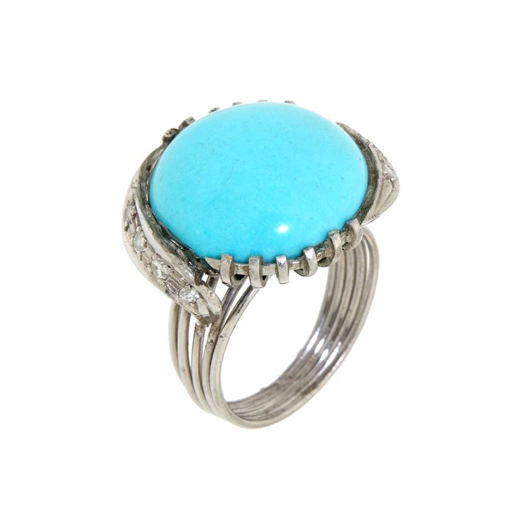 Anello in oro bianco con al centro semisfera in turchese, ai lati piccoli diamanti taglio 8/8