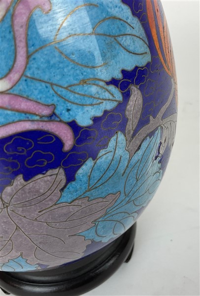 Uovo in smalti cloisonnè con base in legno Cina, secolo XX (h.18cm)(lievi dif