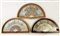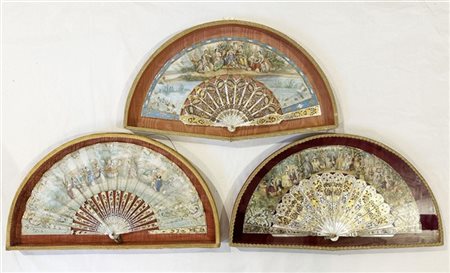 Arte del secolo XIX. Lotto di tre ventagli con stecche in madreperla traforata e dorata, pagine in carta stampata e dipinte a tecniche miste con scene di gioco. Teche in tessuto (difetti)